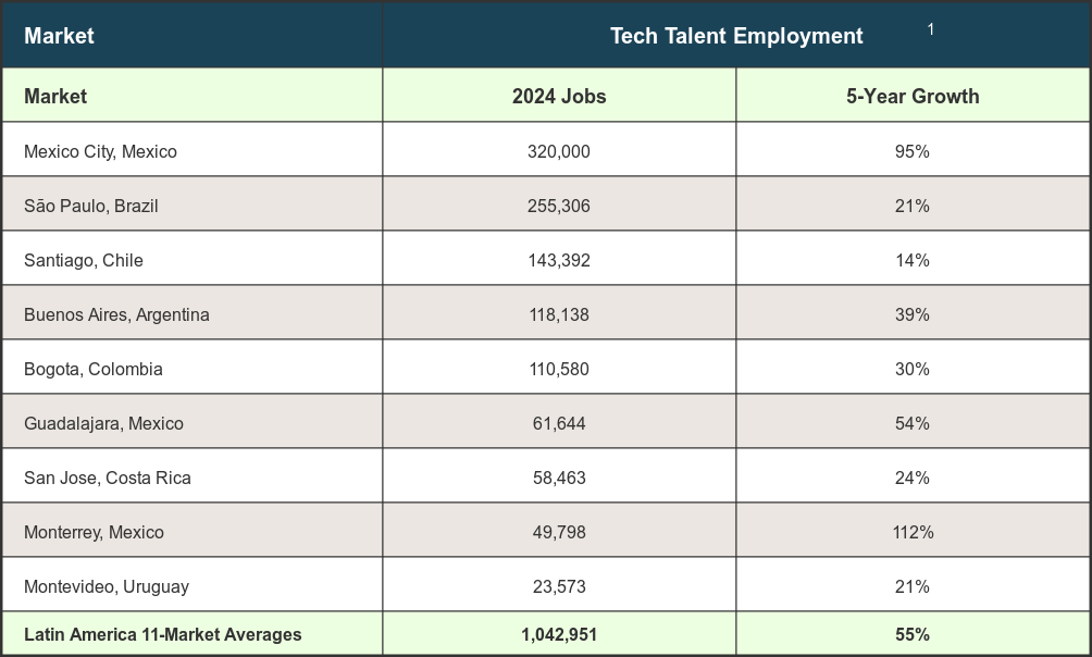 Over the past five years, major US companies, including Braze, Coinbase, Dropbox, Google, Lyft, and Pinterest, have expanded engineering hiring in the region. CBRE’s 2025 Tech Talent Employment Report shows an average 55% tech talent growth rate across eleven Latin American markets—and we expect this momentum to accelerate as companies reassess their global talent strategies.
